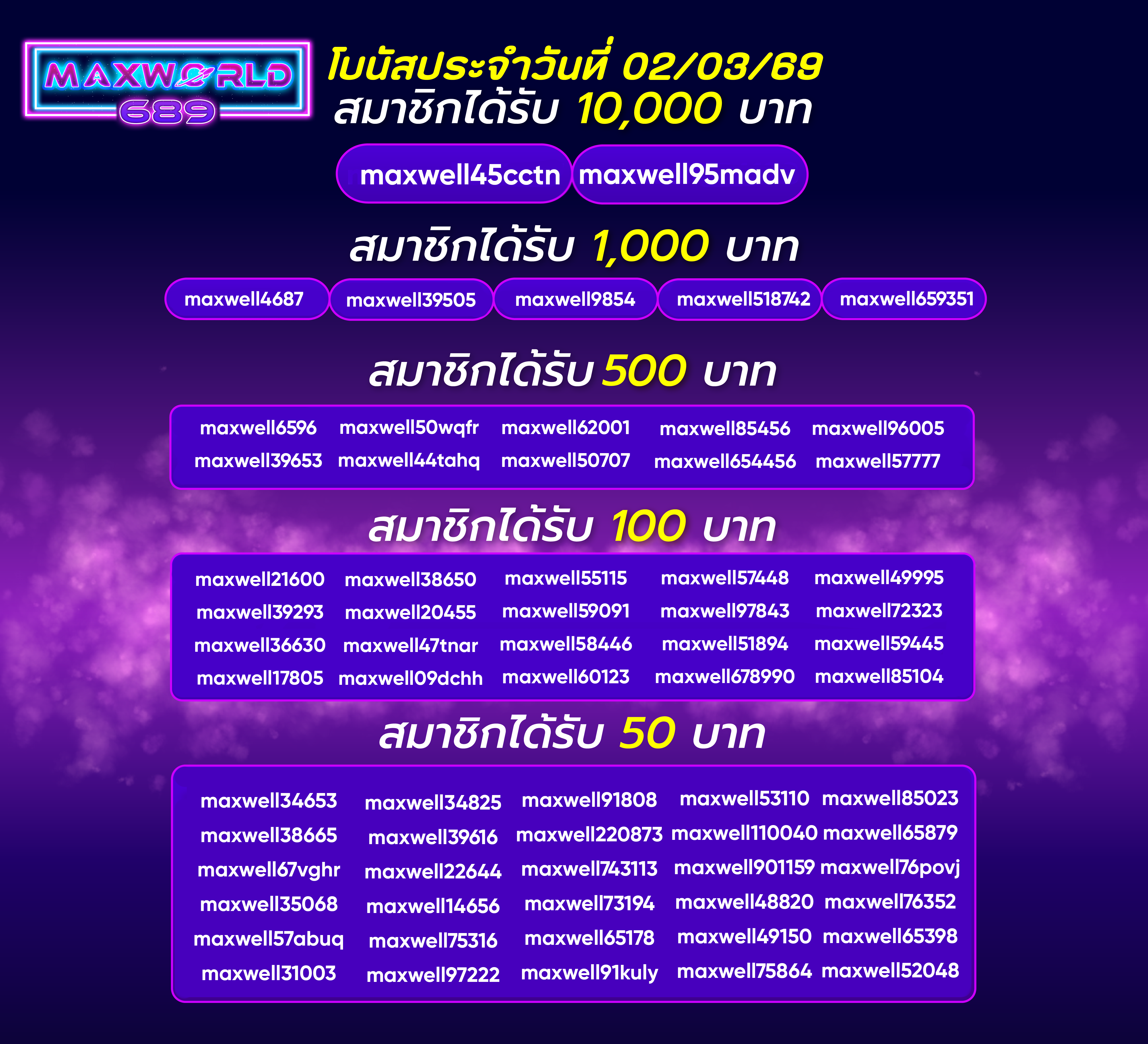 รายชื่อผู้โชคดีรับโบนัสรายวันประจำวันที่ 02/03/69