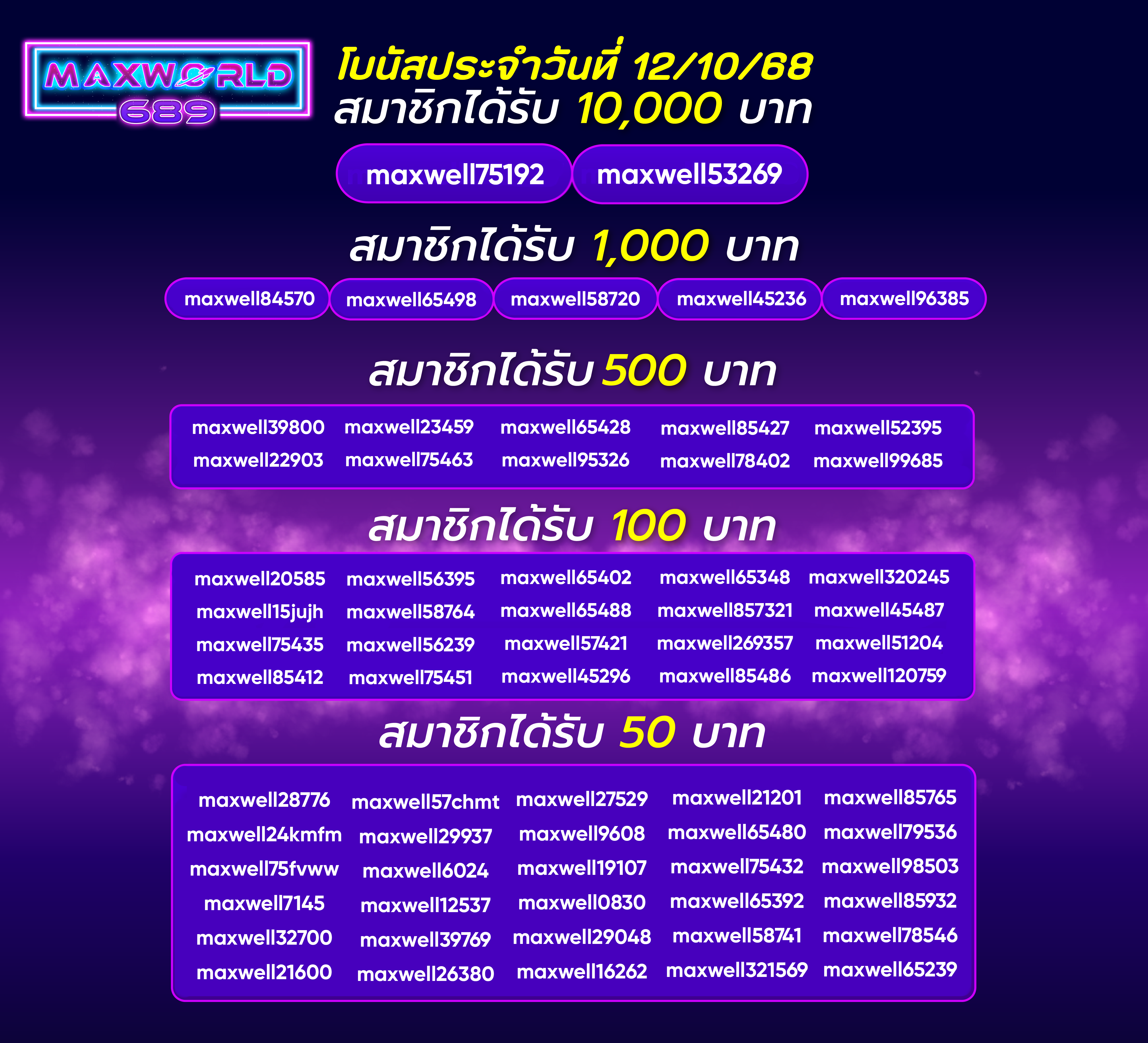 รายชื่อผู้โชคดีรับโบนัสรายวันประจำวันที่ 12/10/68